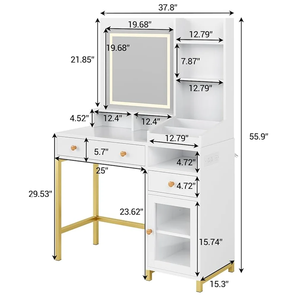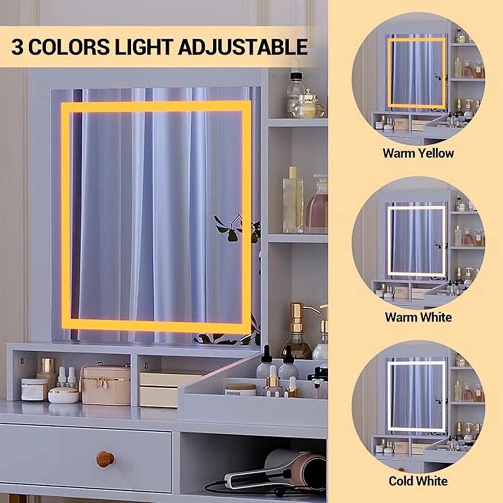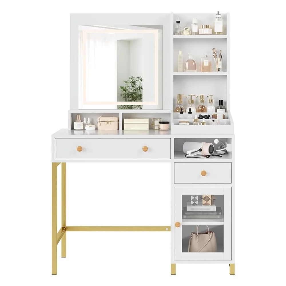 Vanity Desk with LED Lighted Mirror and Drawers Cabinet Open Storage Shelves Dressing Table for Girls Bedroom Makeup Room