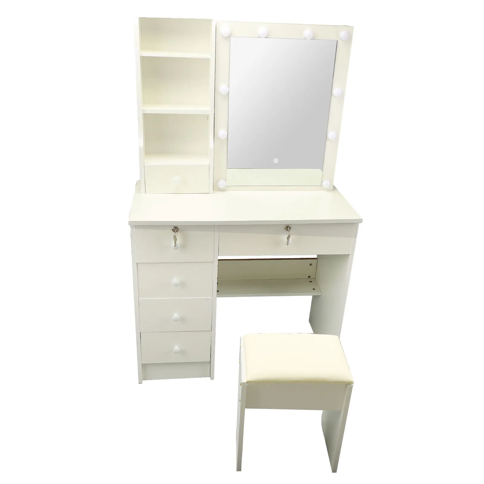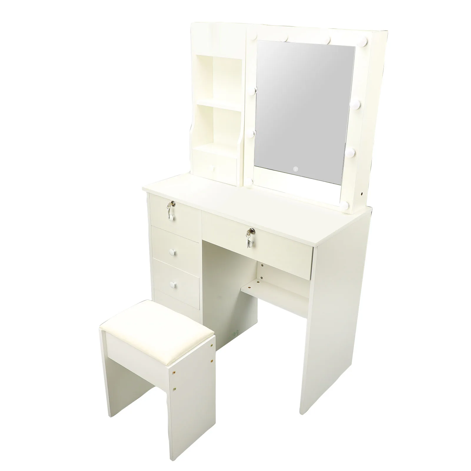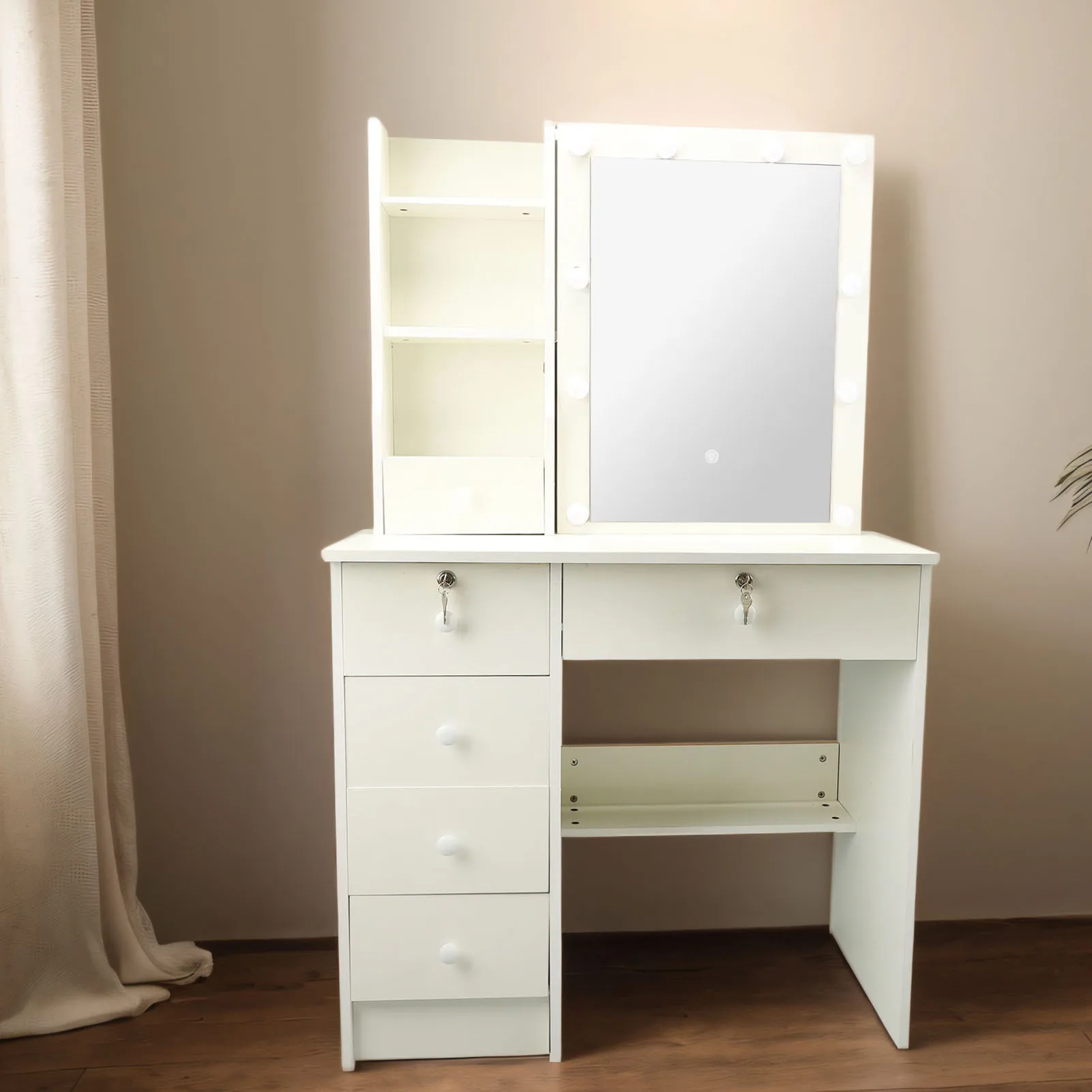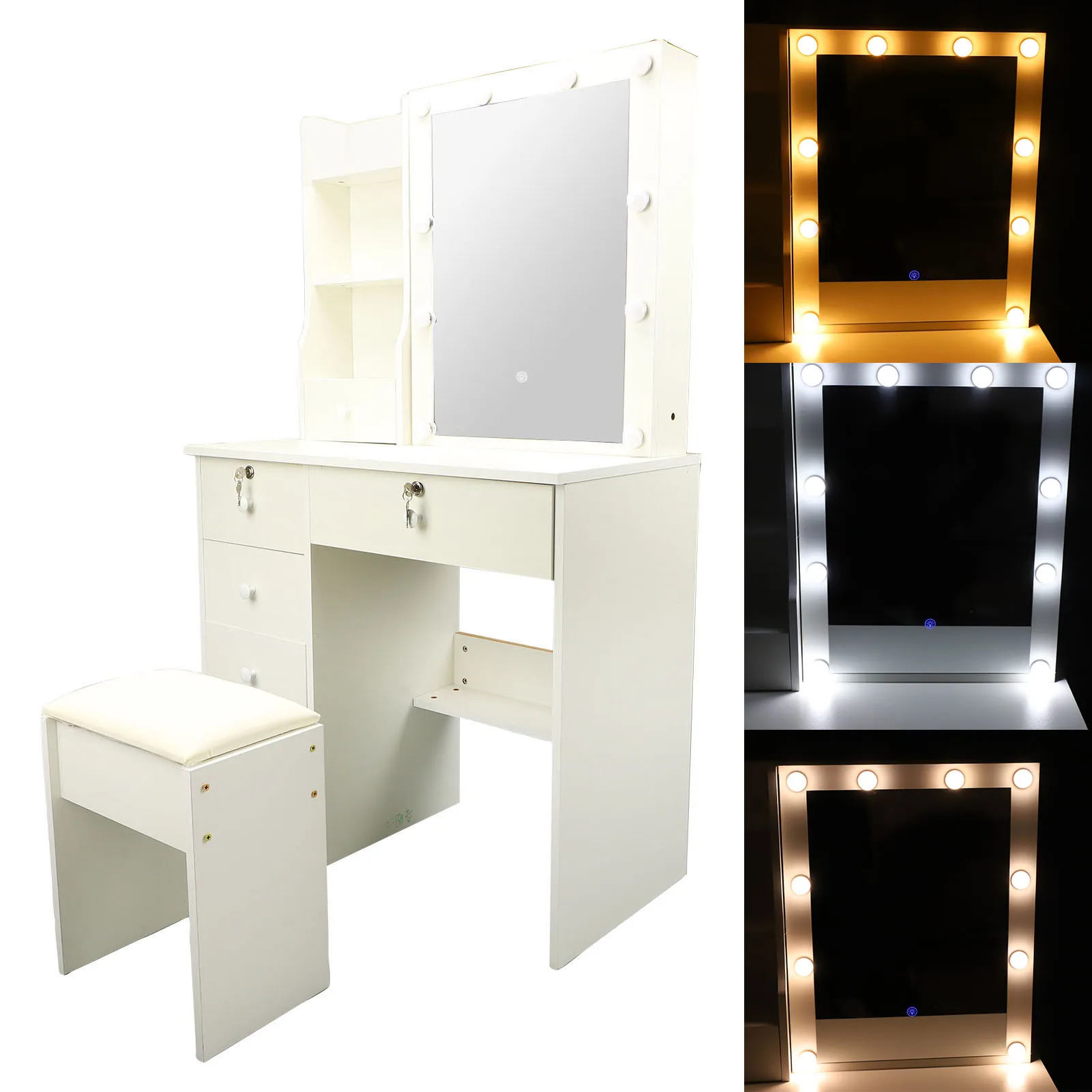 Features | 1、MDF Board Material: Crafted from high density board, the vanity desk has a steady structure. This ensures a significantly extended span of usage, offering long service for years. 2、Mirror and Lights: The dressing table features a fitted mirror with built in lighting. Comes with , it perfectly illuminates your beauty, convenient for makeup. 3、Ample Storage Space: Our makeup vanity desk is designed with several drawers, providing increased storage spaces, perfect for organized storing and decluttering. 4、Multipurpose Usage: Aside from its primary use as a makeup desk, this multifunctional table can also be used as a space to organize your jewellery or even as a study desk. 5、Modern Simple Design: With its modern design and creamy color, the vanity desk is incredibly suitable to be placed in your bedroom, small apartments or any space needing stylish furniture. |