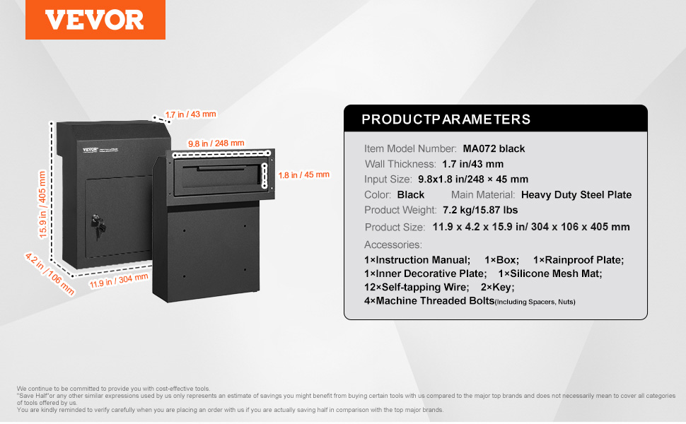 Large Storage Box and Location: The wall-mounted drop box includes a 320 x 158 x 430mm / 12.6 x 6.22 x 16.9 inch storage box that can accommodate various items. The 1.6 x 9.8 inch (40 x 250 mm) slot is suitable for smartphones, envelopes and small packages.