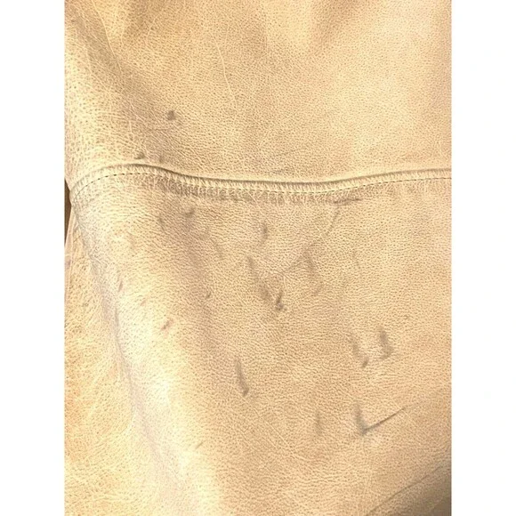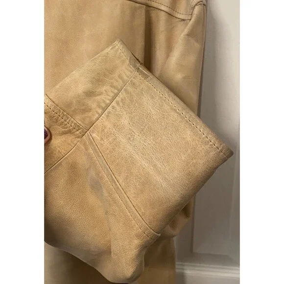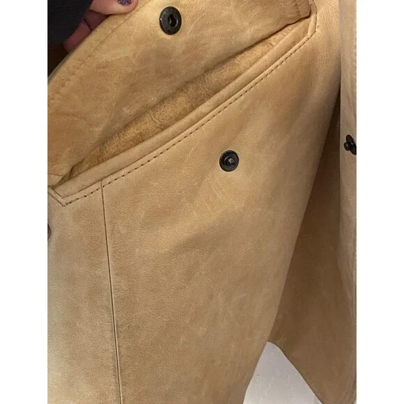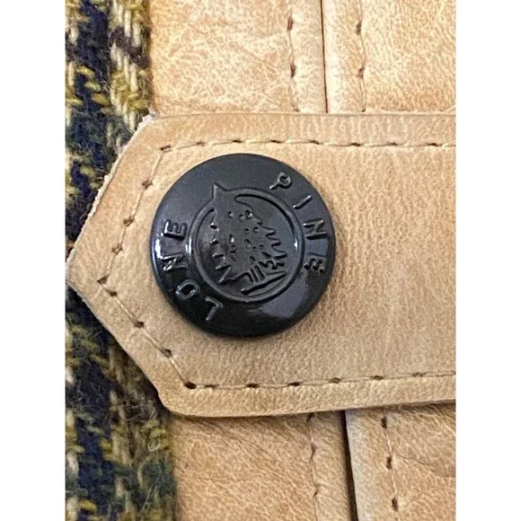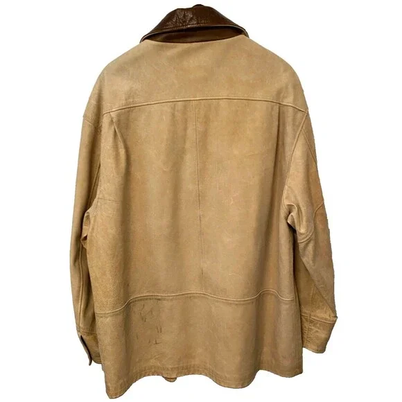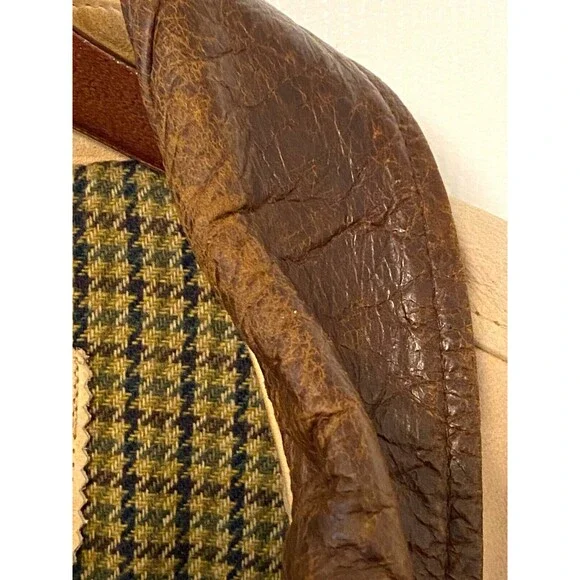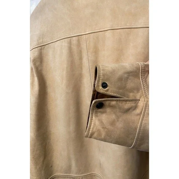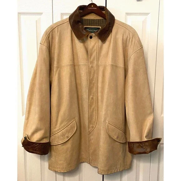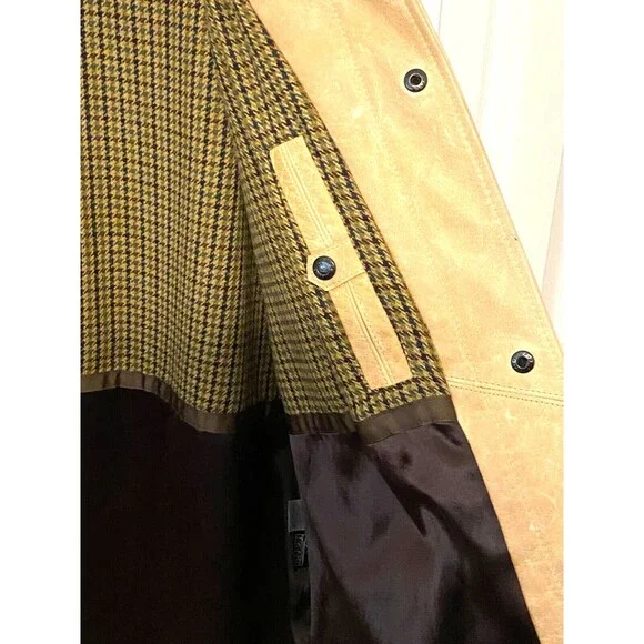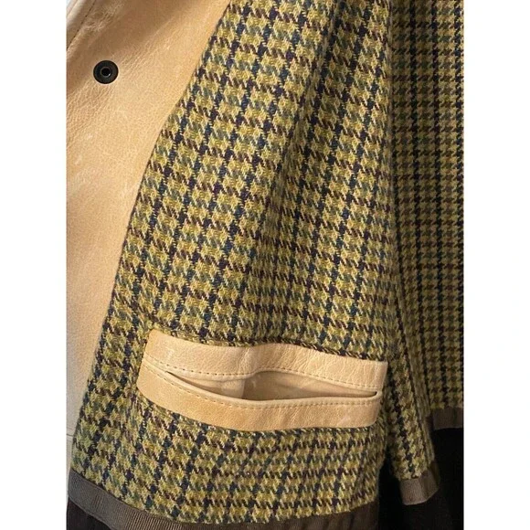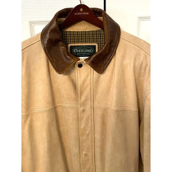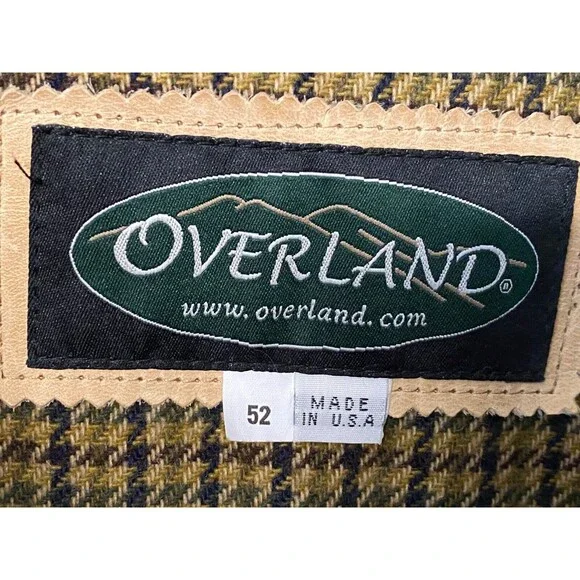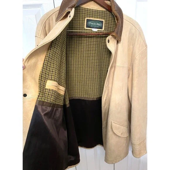 Vtg OVERLAND Leather Wool Jacket Coat Men's 52 USA Made Beige Brown HoundstoothHeavy leather coat, with wool blend lining in a houndstooth pattern. Beige/tan color with contrasting brown collar and interior sleeve cuffs. Snap front closure. Soft, flexible leather.Overall good condition - some wear on the collar & could use professional cleaning, if desired.Men's size 52 - Made in the USAMeasurements laying flat:Chest: 29.5"Length: 34"