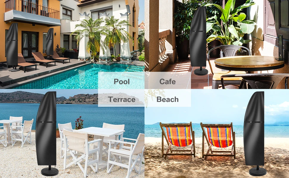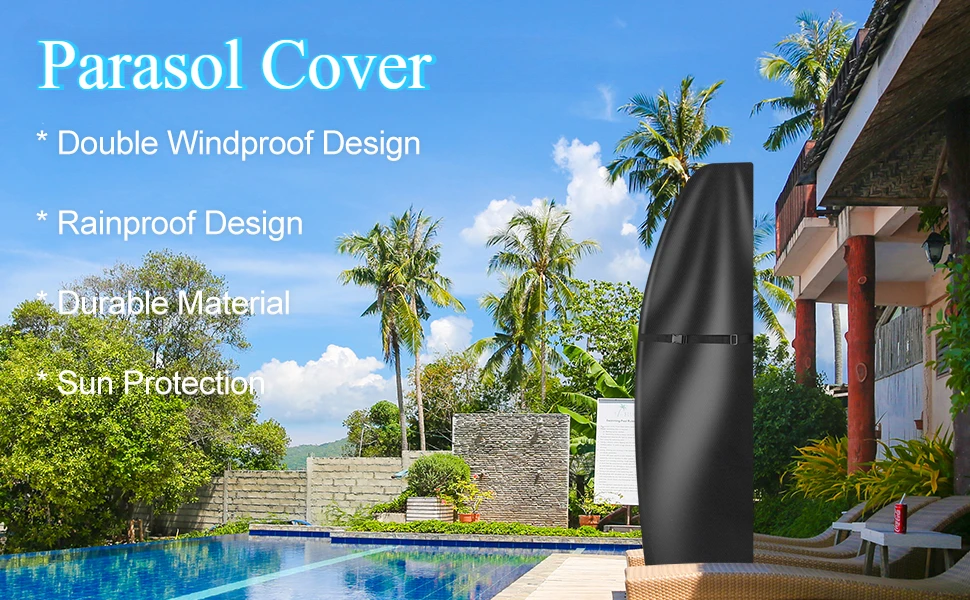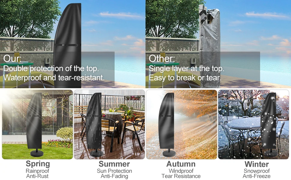 This heavy-duty parasol cover is waterproof, UV-resistant, tear-resistant, and fade-resistant, better protect your parasol from harsh environments such as strong sunshine, rain, snow, dust, and more.