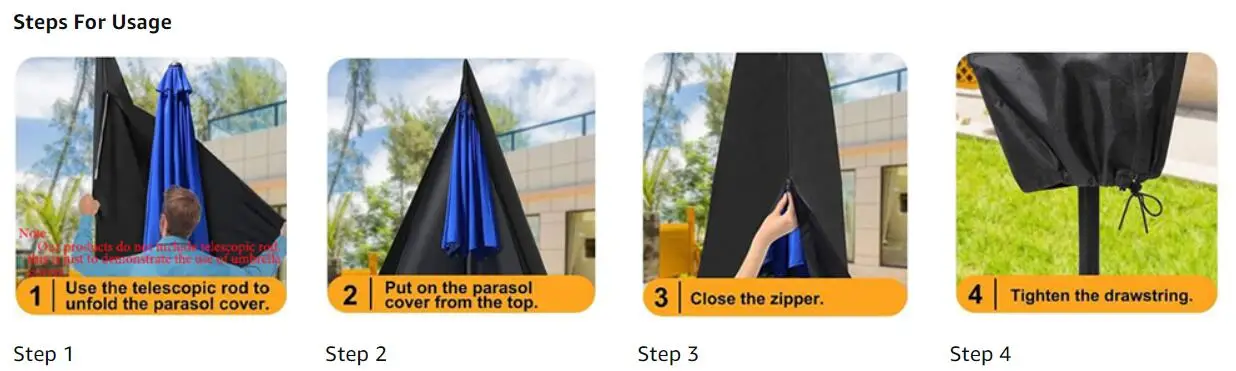 Zipper makes the cover easy to open and close. Coming with a rod, helps to easily apply the cover on the parasol. It's very easy to wash, just need to hose the cover down with water and dry it up in the sun. This cover comes with a carrying bag for easy storage when not in use.