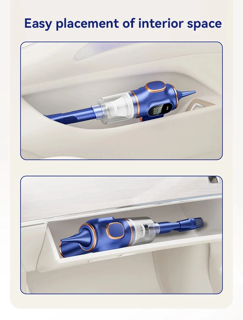 Using multiple 2000mAh lithium-ion batteries and fast charging technology, the battery life can be extended by about 60 minutes after being fully charged. Our fast charging technology includes lithium-ion battery surge protection to ensure safe operation. LED lights on cordless car vacuums are great for lighting up those dark, hard-to-see places.