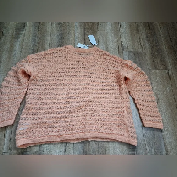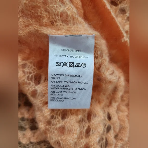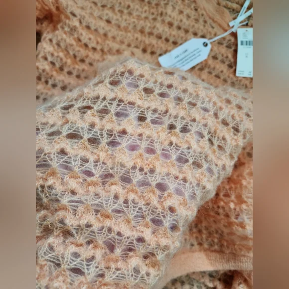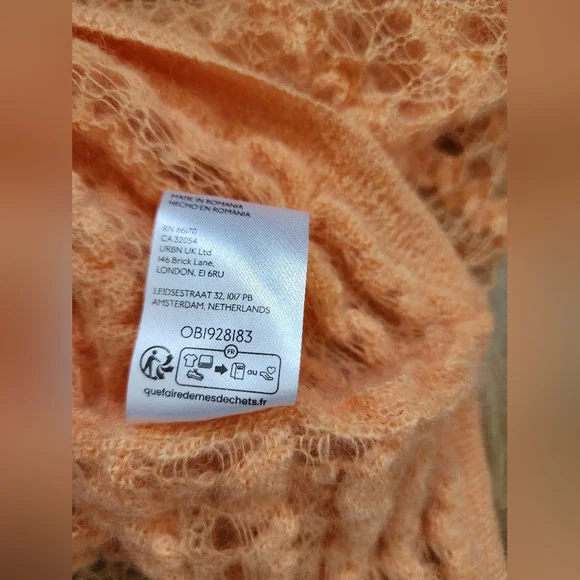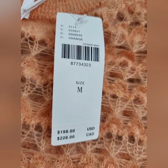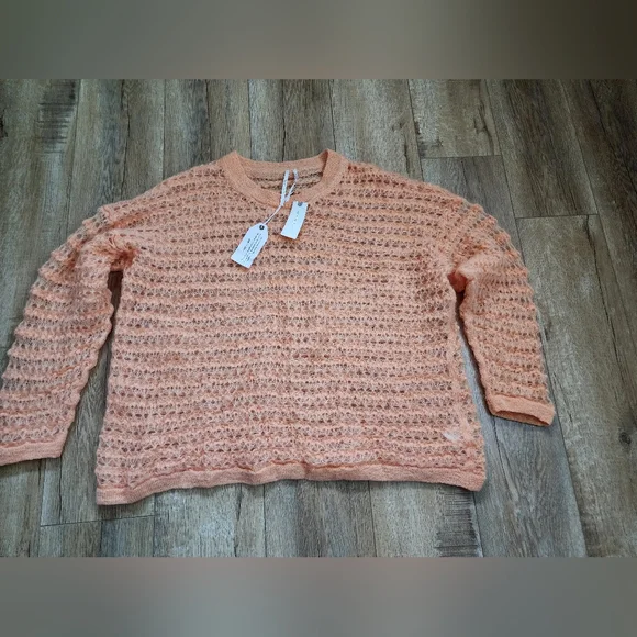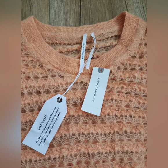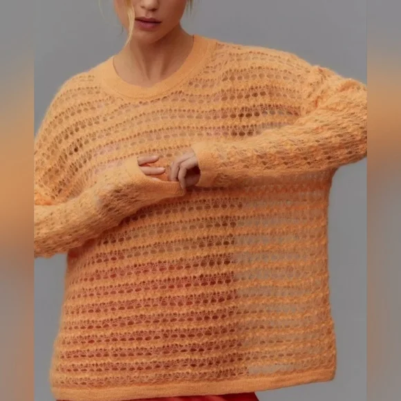 $198 NWT Anthropologie Open-Stitch WOOL pullover crocheted sweater M Spider WebRelaxed and laid down pit to pit 24in, length 23in.This Anthropologie sweater is an open-knit pullover with eyelets and crocheted knit accents. Made of 72% wool blend, it features a crew neck, long sleeves, and a relaxed fit in size M. The vibrant orange color and sheer, ultra lightweight fabric make it perfect for festive occasions like weddings, parties, or casual wear. The design is reminiscent of a spider web, adding a colorful and designer touch to your outfit.