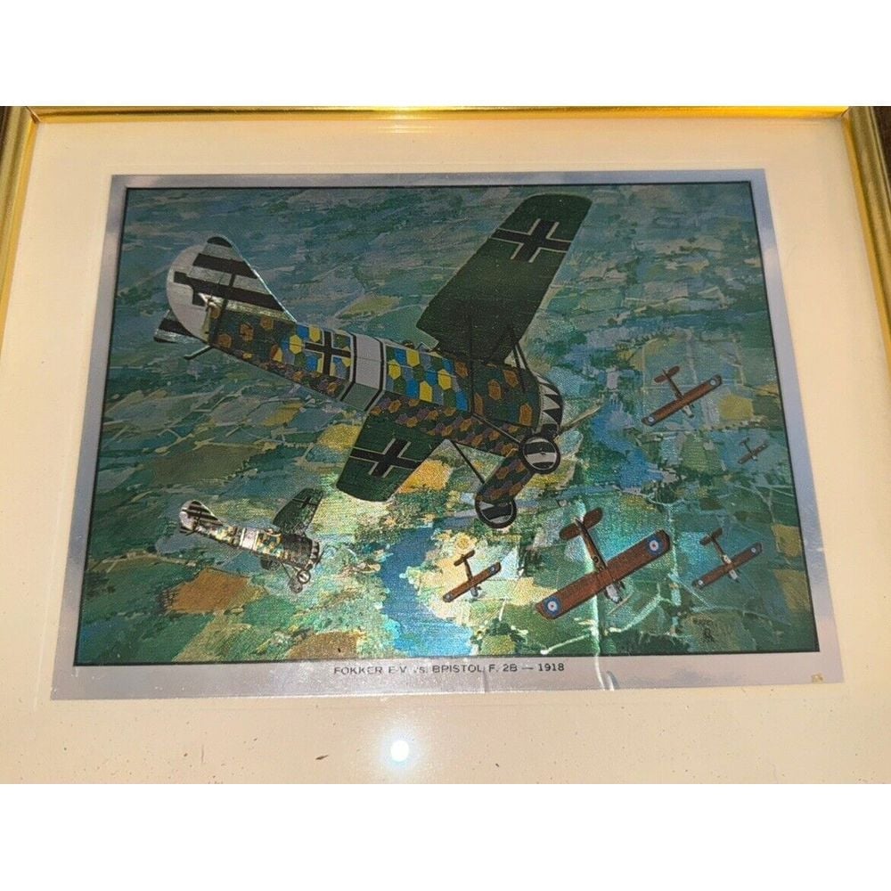 The product is a set of four framed color etch foil prints featuring war planes from the years 1916-1918. These reproductions are themed around militaria, specifically focusing on World War I (1914-18) aircraft. The prints are made in the United States, showcasing a selection of historical military planes in vibrant color and detail.