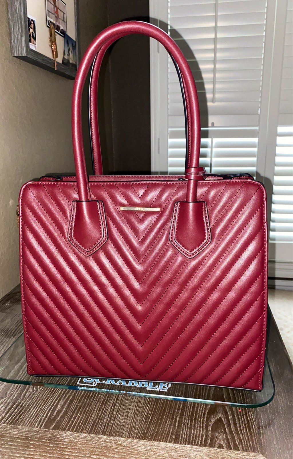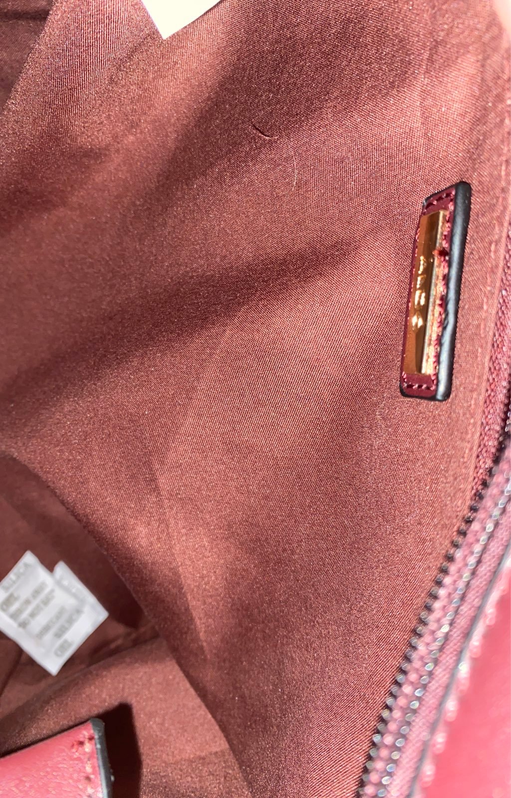 Quilted faux leather merlot Color Gold Trim Top zip closure Rolled top handle with 6½” drop Removable chainlink strap with 23” max. drop Exterior Pockets: 1 zip Interior Pockets: 1 zip, 2 slip Fabric lining 12½" L x 5" W x 10½" H
