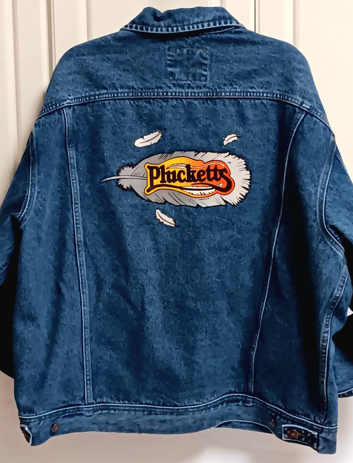 Lee Dark Blue Denim Plucketts Trucker Biker Outdoor Blue White Label Mens Y2K Button Jacket Size XL Vintage. Gently pre-loved, great, clean condition. All of the buttons are intact. The back of the jacket has a Plucketts advertising embroidered 4 Feathers. Measures approximately 25" pit-to-pit, 27" length, and 25" sleeves. Weighs approximately 3 lbs unboxed. No lining. It also has two button pockets in the chest and a slide in pocket on each side. The patch is labeled 2000 O.A.A. Inc. See photos.