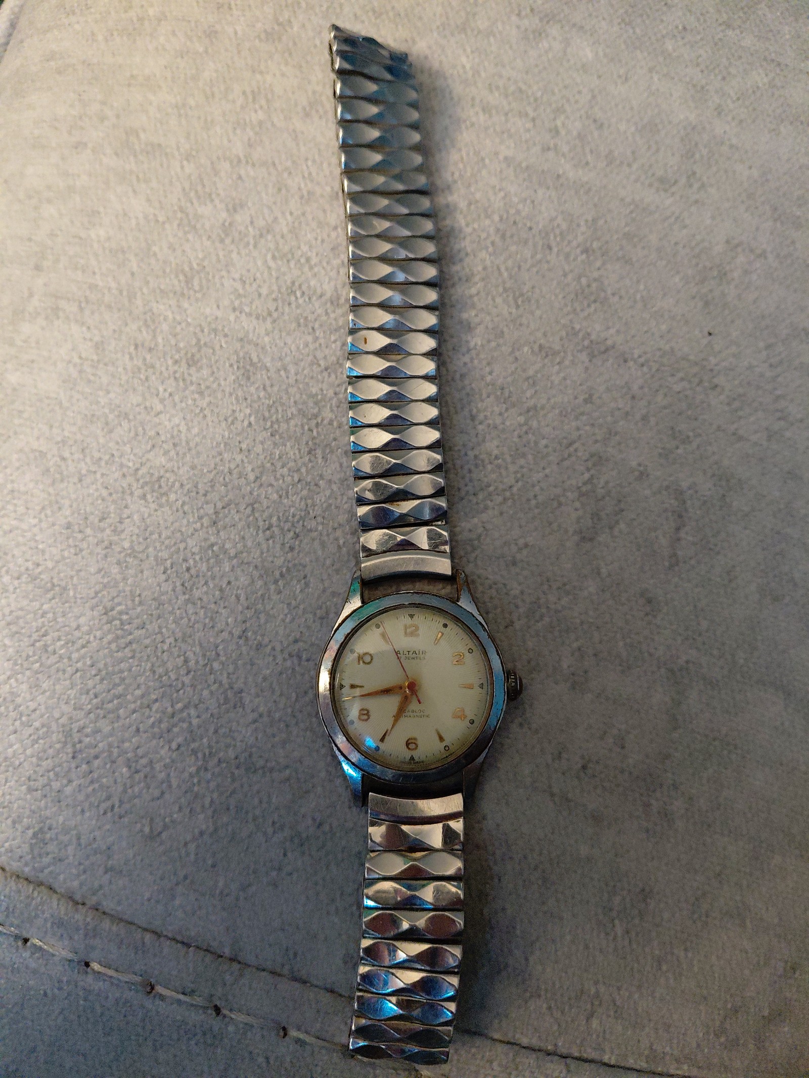 Here is a Vintage Altair 17 Jewels Watch from the 1950s in poor condition. The Watch face itself looks pretty good for its age but the Watch band is broken and needs to be replaced. Would be a great project Watch or a good collectors watch. Make me an offer if you are interested.