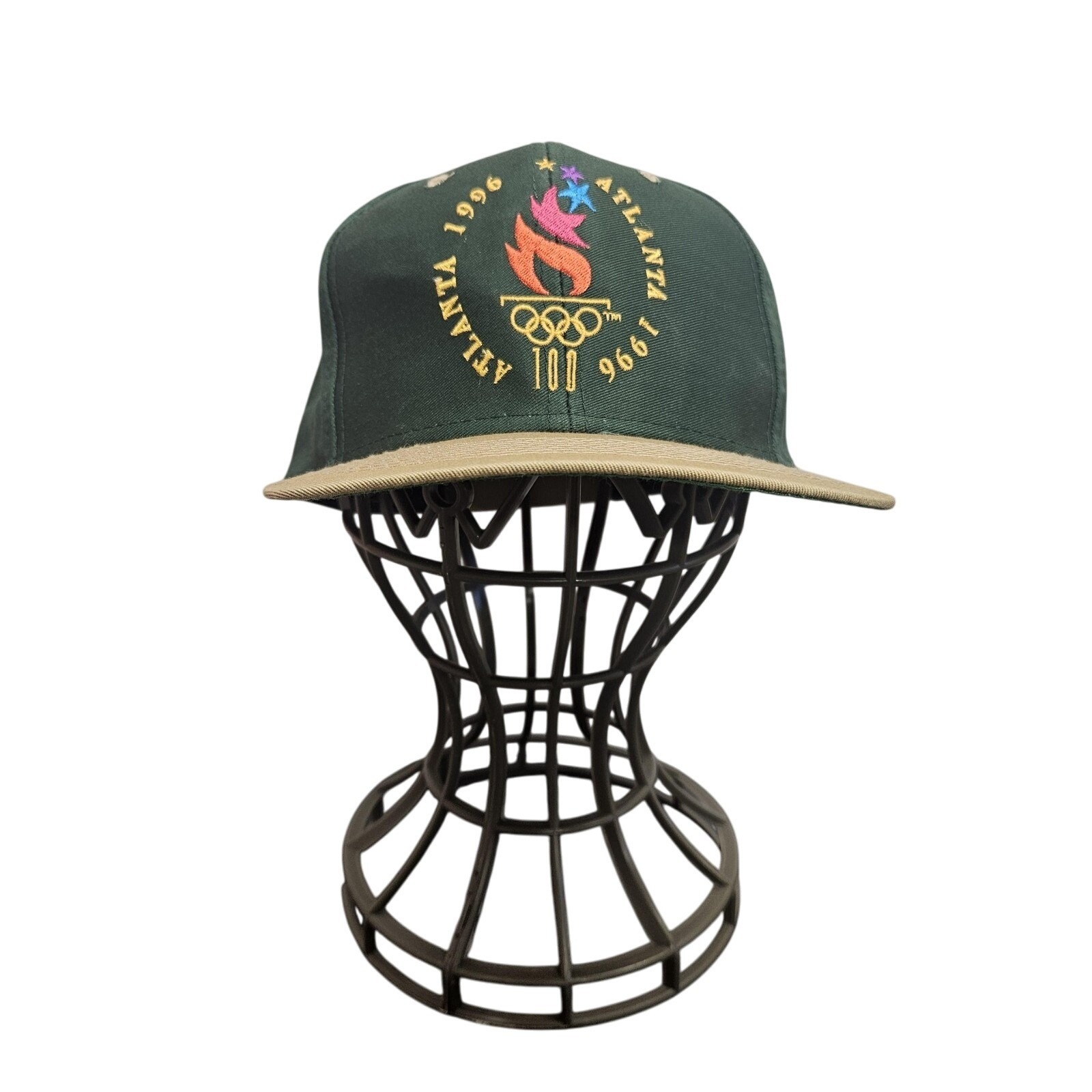 Classic 1996 Atlanta Olympic Games snap back hat featuring the iconic Olympic flame and rings logo embroidered on the front. Green crown with tan brim and matching tan plastic snap closure. 'Centennial Olympic Games' commemorative design.